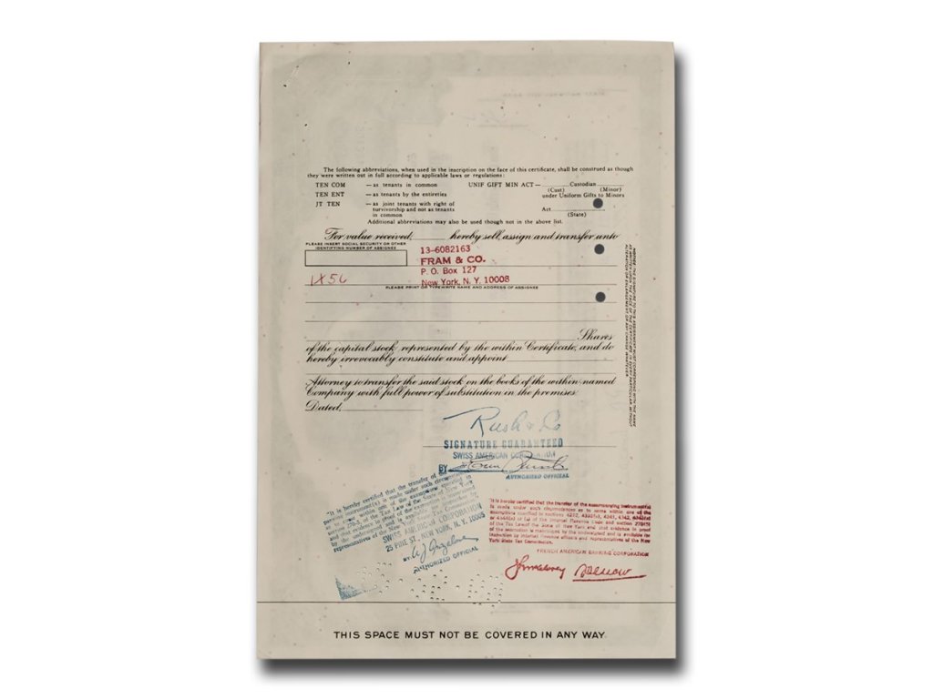 Tento certifikát je jedinečnou připomínkou raného průmyslového věku Ameriky a důležité role tabákového průmyslu. Vhodný pro sběratele historických dokumentů, akciových certifikátů i milovníky americké historie.