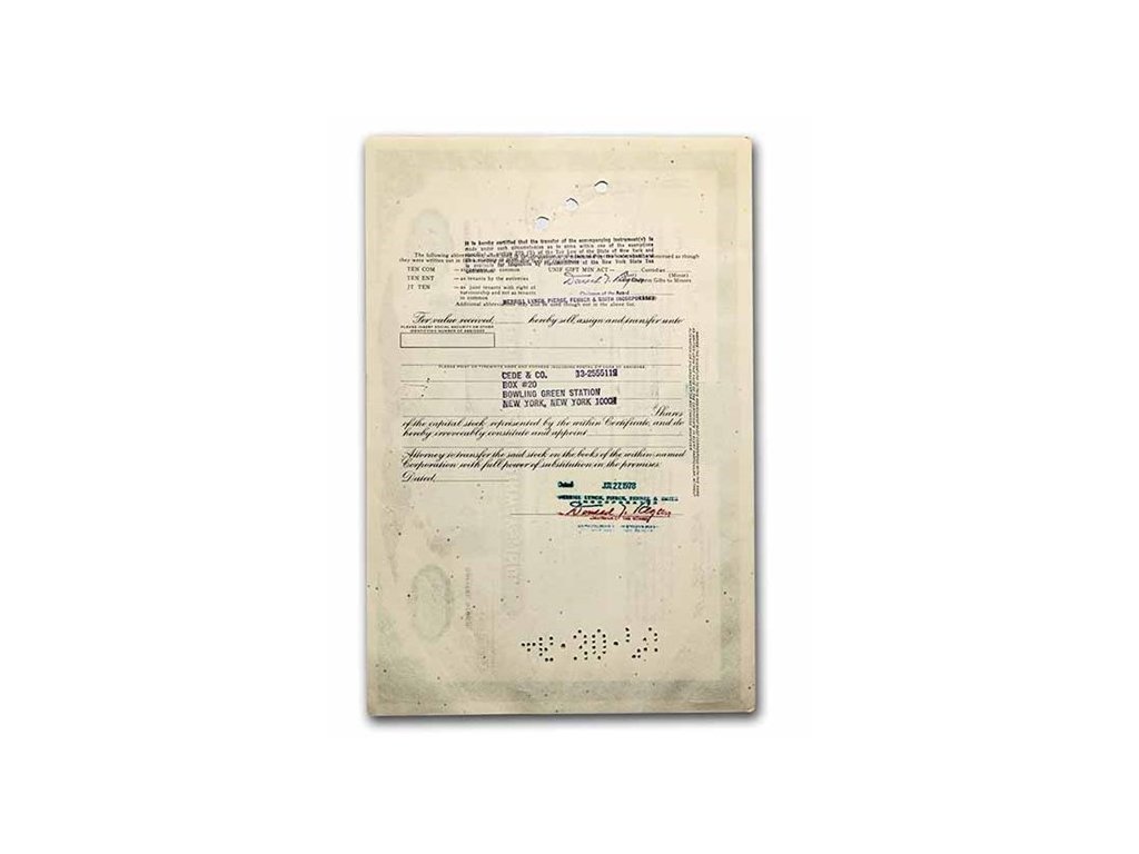 Tento originální akciový certifikát společnosti Pan American World Airways, Inc. pochází od jednoho z největších průkopníků komerční letecké dopravy. Pan Am sehrála klíčovou roli v rozvoji mezinárodního létání a stala se symbolem zlaté éry amerického civilního letectví.