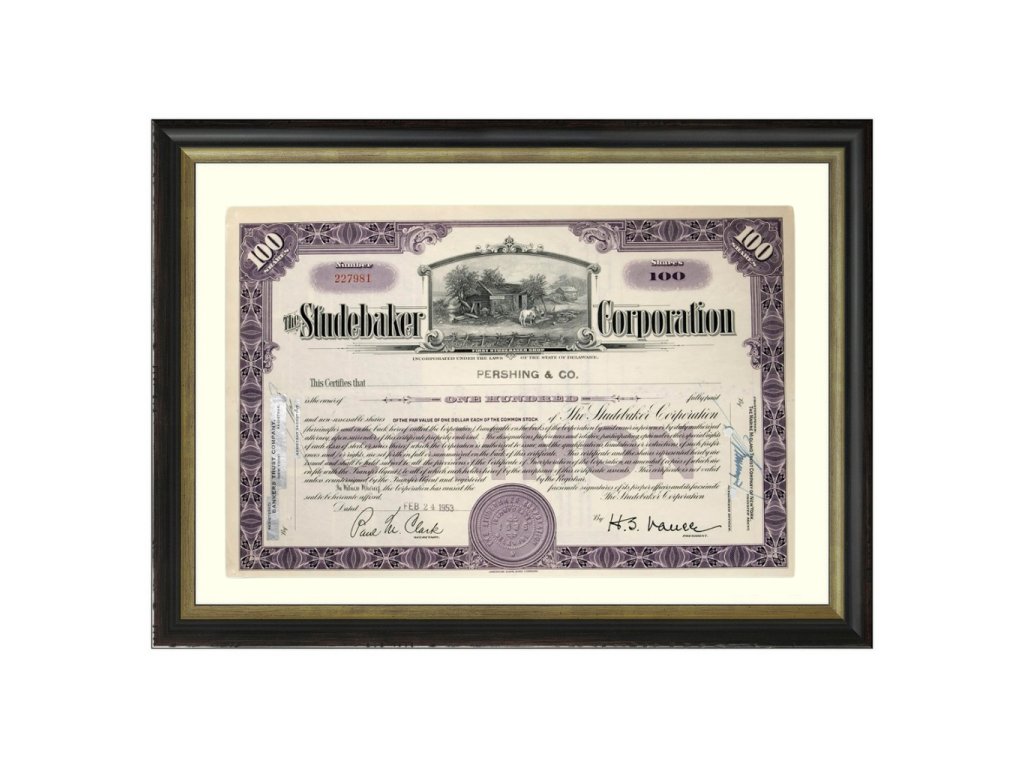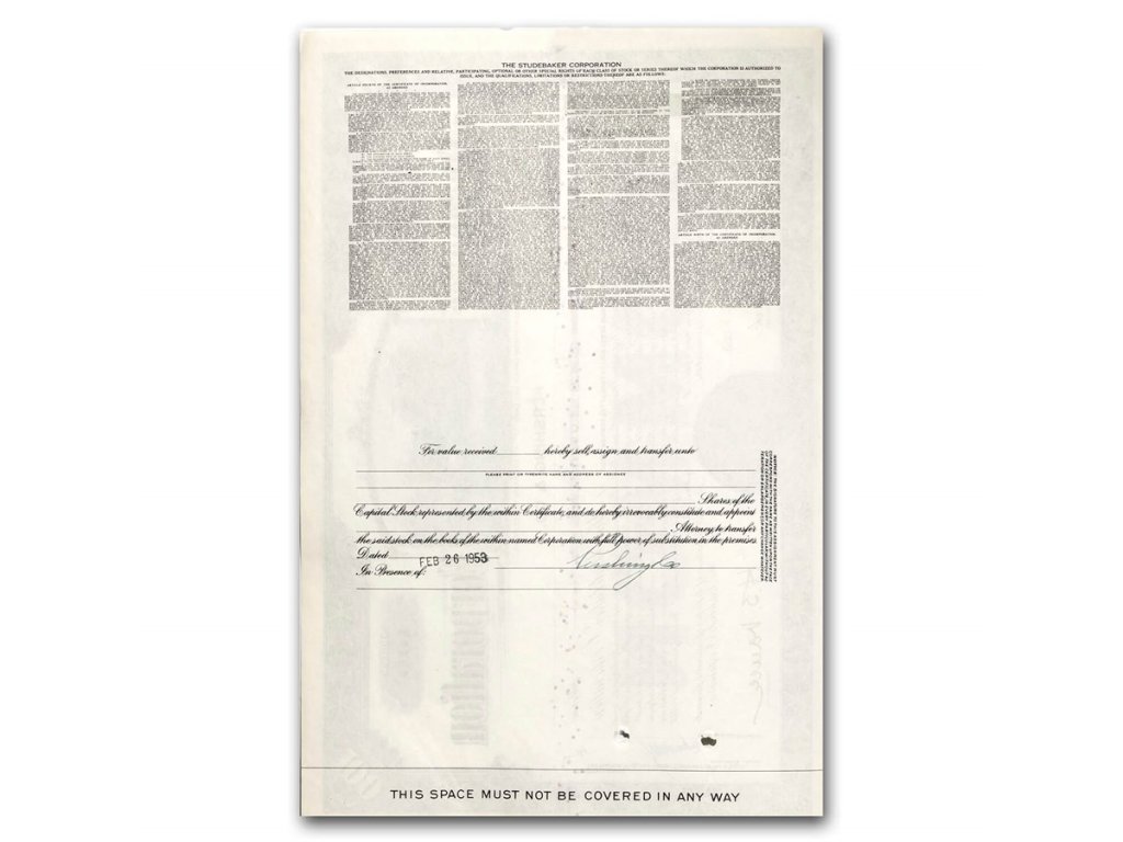 Tento historický akciový certifikát pochází od Studebaker Corporation, jedné z nejstarších a nejikoničtějších amerických automobilových společností. Nabízí fascinující vhled do vývoje průmyslu od výroby vozů tažených koňmi až po inovace v oblasti elektromobilů.