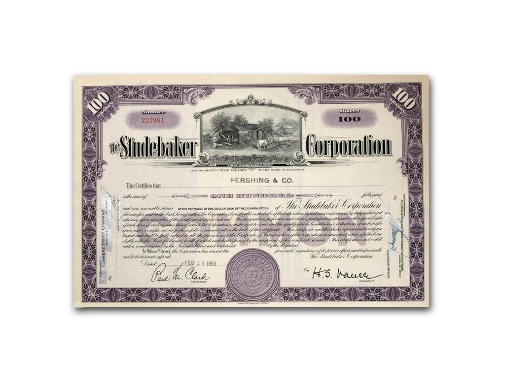 Historický akciový certifikát – Studebaker Corporation (fialový)