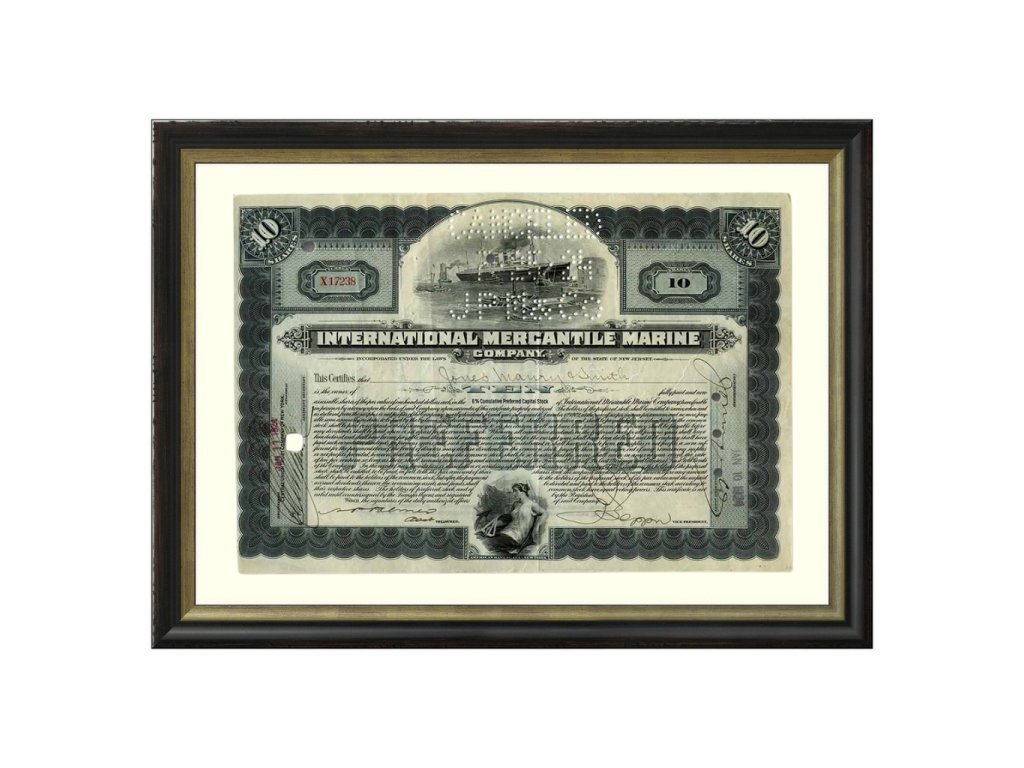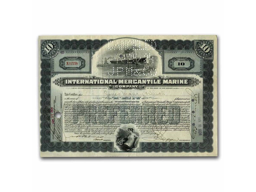 Tento slavný akciový certifikát „Titanic“ pochází od společnosti International Mercantile Marine Company, vlastníka nechvalně proslulé lodi Titanic. Jedná se o první, starší styl certifikátu dodávaný v modrošedé barvě.