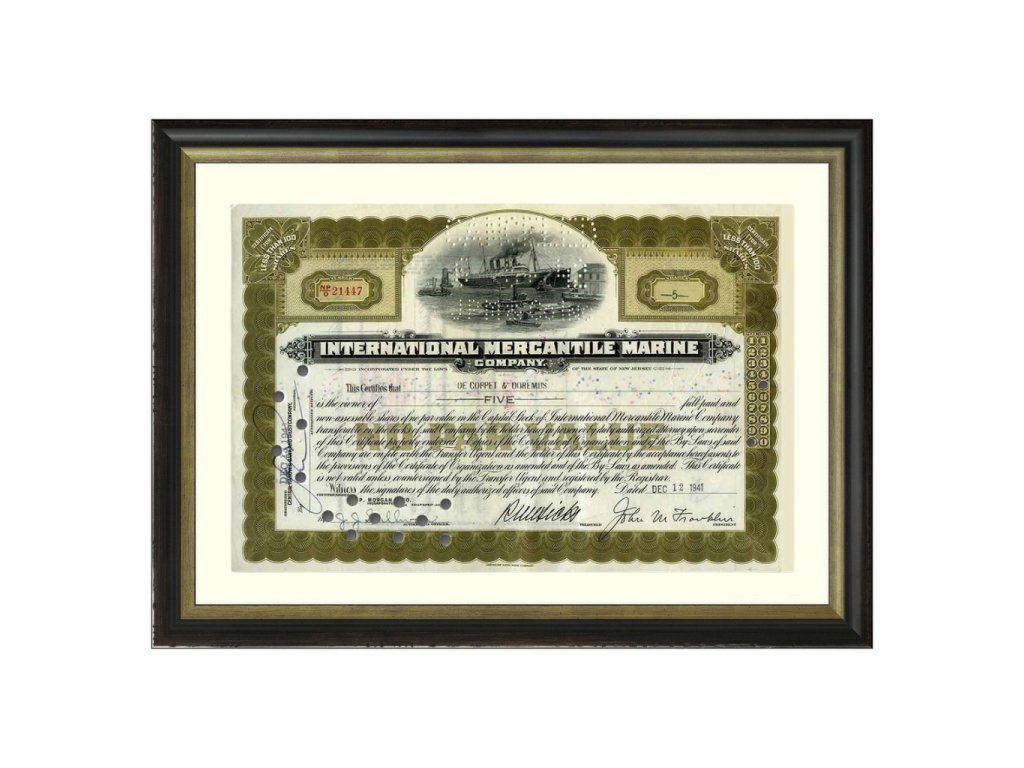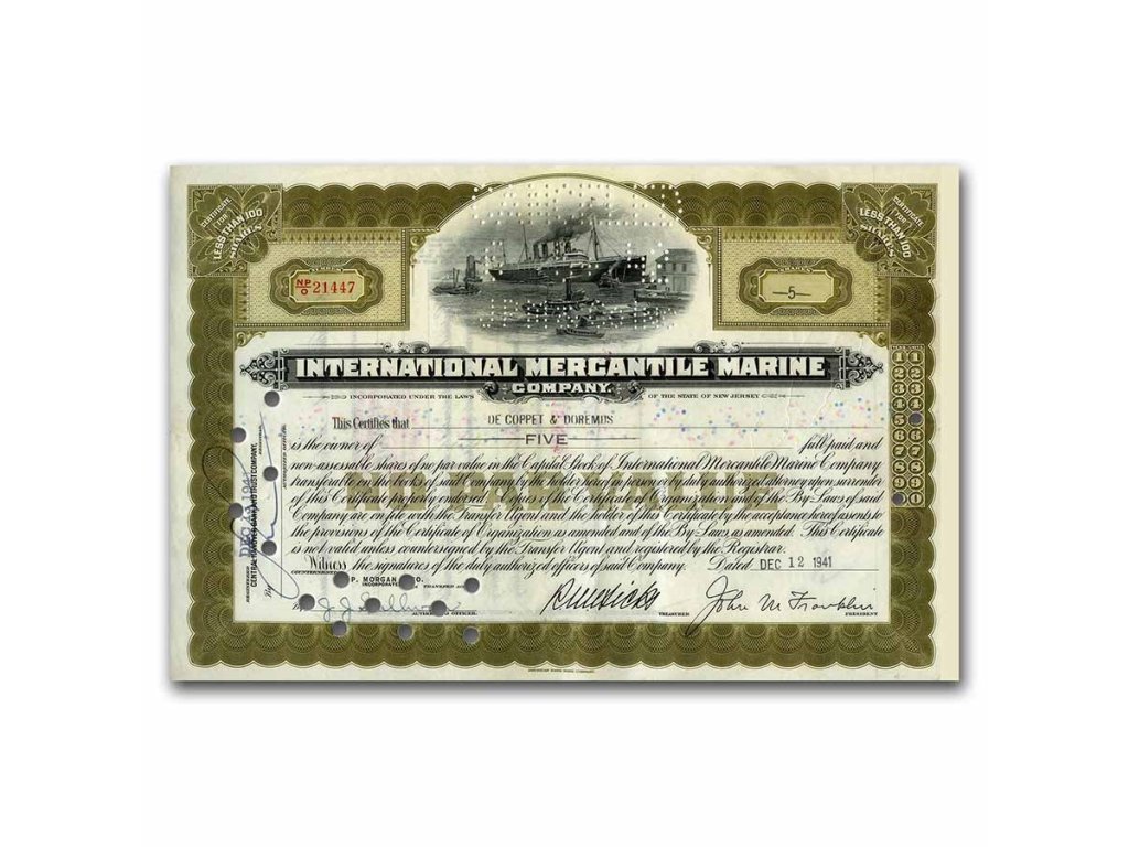 Tento mimořádný akciový certifikát pochází od společnosti International Mercantile Marine Company – vlastníka slavného parníku Titanic. Jedná se o autentický druhý typ akcie v nominální hodnotě 5-100$ USD, tištěné ve výrazné modrošedé barvě, obvyklé pro americké cenné papíry z počátku 20. století.