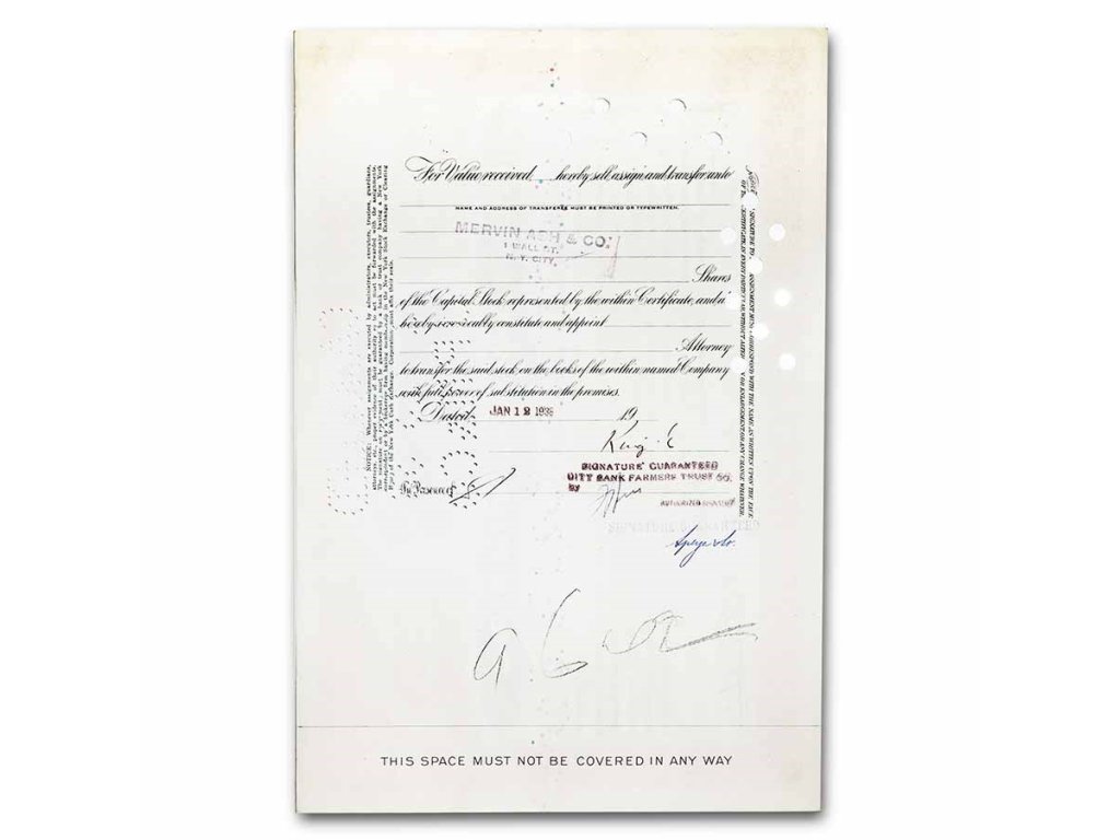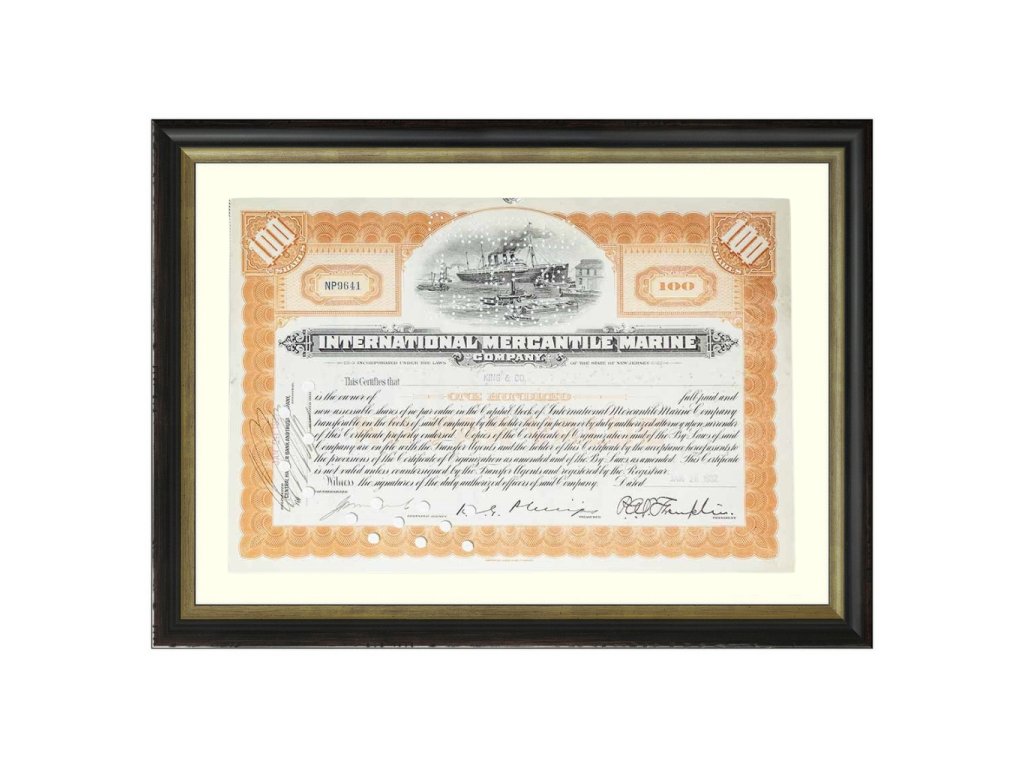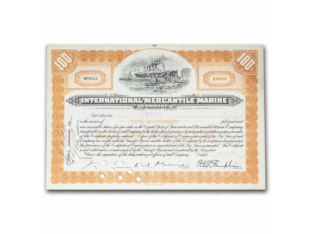Tento originální akciový certifikát pochází od International Mercantile Marine Company, někdejšího vlastníka slavného parníku Titanic. Jedná se o novější, tzv. druhý styl certifikátu z let 1930–1940, tištěný ve výrazné oranžové barvě.