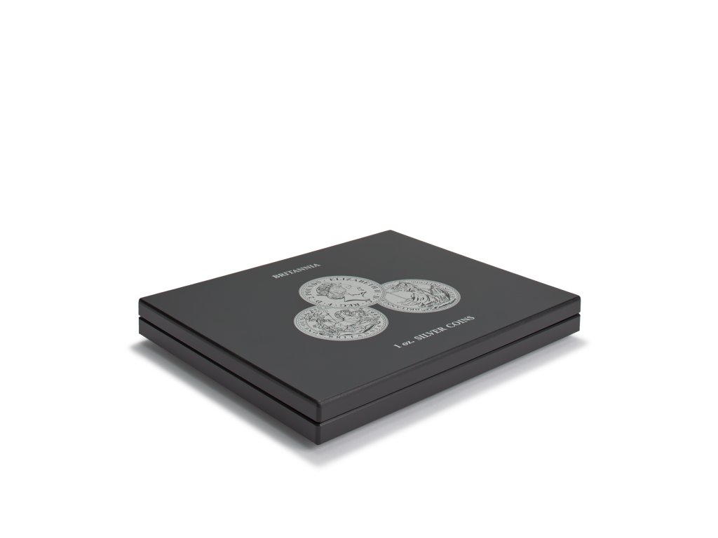 Ušlechtilé černé pouzdro na mince pro uložení 20 stříbrných mincí Britannia (verze: 1 unce) v kapslích (vnitřní Ø 38 mm). 1 vložka s černým velurovým povrchem a 20 kulatými poli (Ø 44,2 mm). Potisk víka a polštářku stříbrné barvy s motivem mince. Polstr víka čalouněný černým saténem Bezpečné a nenápadné magnetické zavírání.? Vnější formát: 305 x 30 x 245 mm Kapsle nejsou součástí balení.