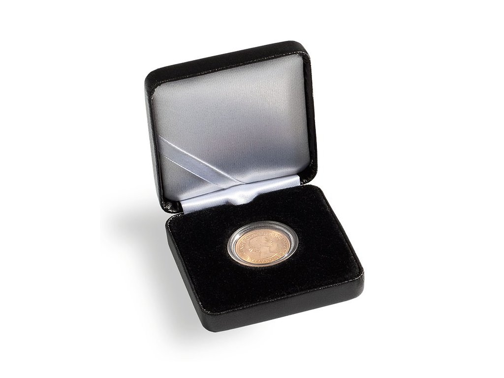 Pro sofistikované uložení zapouzdřených mincí doporučujeme tyto elegantní kovové mincovní pouzdra. Hedvábně matná, koženková potahová látka a sametová vložka dodávají těmto pouzdrům obzvláště elegantní vzhled. V polštářku víka je saténová stuha, kterou lze použít k uložení případného certifikátu. Díky vysoce kvalitnímu kovovému jádru je toto pouzdro nejen ideální pro skladování, ale i pro bezpečnou přepravu.