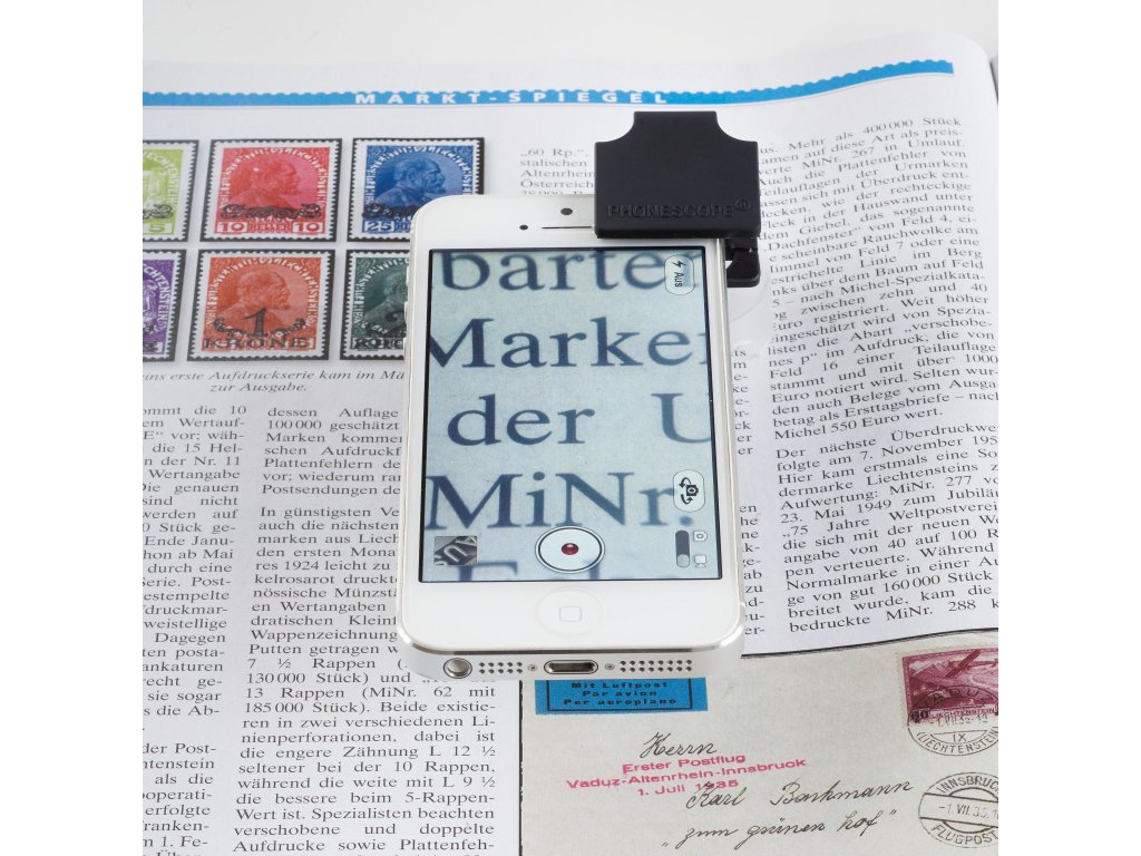 PHONESCOPE je inovativní makro objektiv, který promění váš chytrý telefon nebo tablet v výkonný digitální mikroskop s až 60násobným zvětšením. Díky kameře vašeho zařízení lze snadno rozpoznat i ty nejjemnější detaily – například mincovní značky, strukturu ražby, tiskové techniky známek a mnoho dalšího.