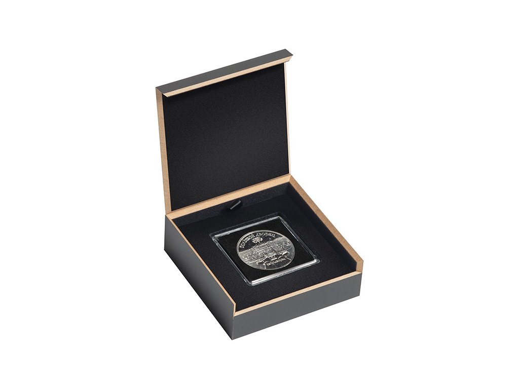 Pouzdro na 1 mincovní kapsle Quadrum 50x50mm z MDF. Polstr víka je čalouněný černým saténem. Spodní část s velurovým povrchem. Rozměry prohlubně na kapsli 50 x 50 mm. Mincovní pouzdro Luxor má rozměry 90x90mm.