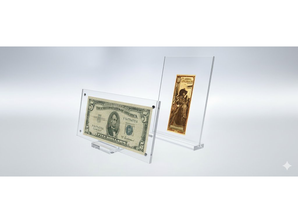 Prémiový akrylový stojánek na bankovky a mince - Křišťálová elegance pro vaši sbírku