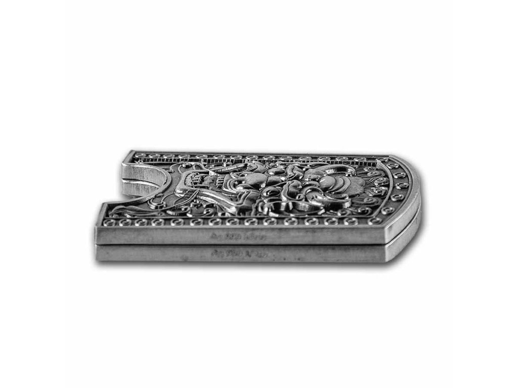 Díky propracovanému reliéfu, jemné patině a chytrému tvarování je medaile nejen vizuálně působivá, ale také praktická pro stohování – jednotlivé kusy do sebe přesně zapadají.