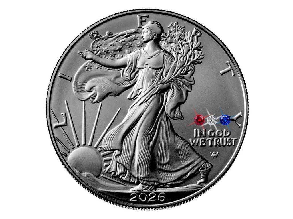 Mince je zdobena třemi syntetickými diamanty v barvách americké vlajky: