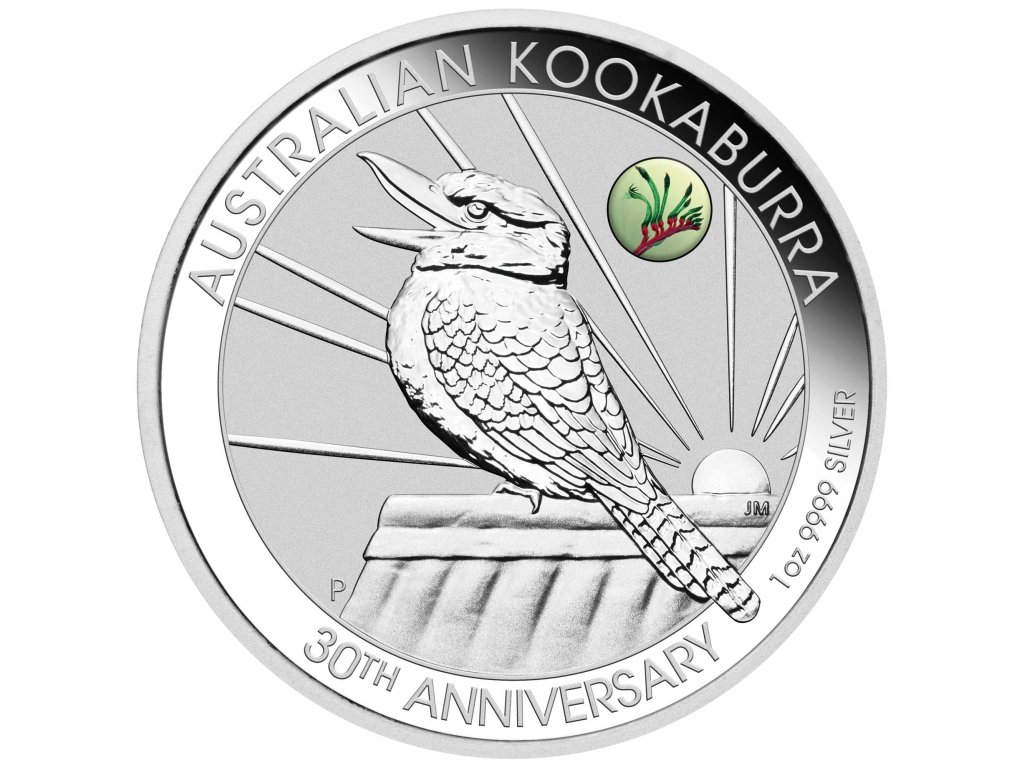 Reverz (Reverse): Kookaburra sedící na střeše za úsvitu se stylizovanými paprsky, barevná privy značka Kangaroo Paw, nápis „AUSTRALIAN KOOKABURRA 30TH ANNIVERSARY“, značka mincovny „P“ a údaje o hmotnosti a ryzosti.