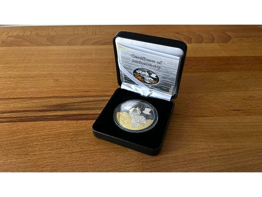 Mince je vyražena z 1 oz ryzího stříbra .999 a doplněna o luxusní kombinaci 24k zlacení a Antique finish povrchu, což vytváří výrazný kontrast a prémiový vzhled.
