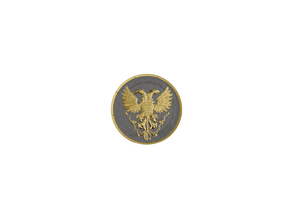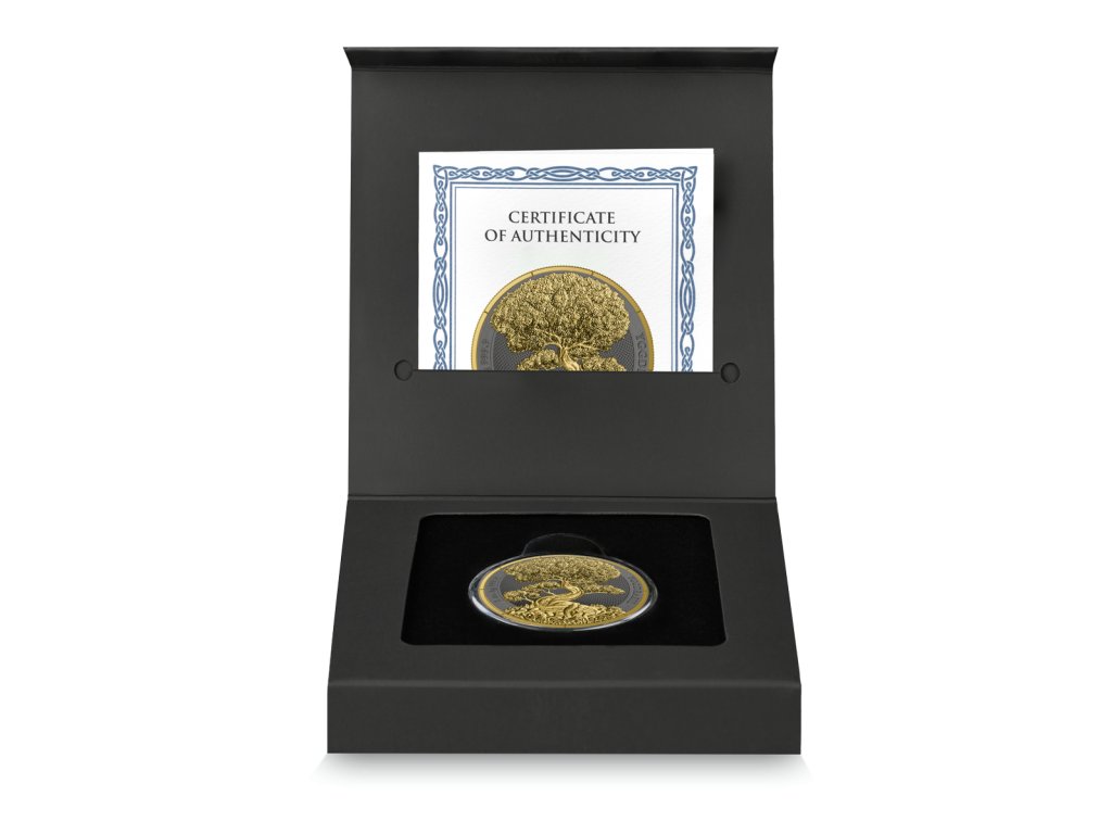 Celý povrch mince je zušlechtěn kombinací zlacení a rutheniové úpravy. Zlato dodává designu majestátní lesk, zatímco tmavý rutheniový podklad vytváří dramatický kontrast, který zvýrazňuje každý detail kompozice. Zlatý strom, dvouhlavý orel i pozlacený okraj tak výrazně vystupují z temného pozadí.