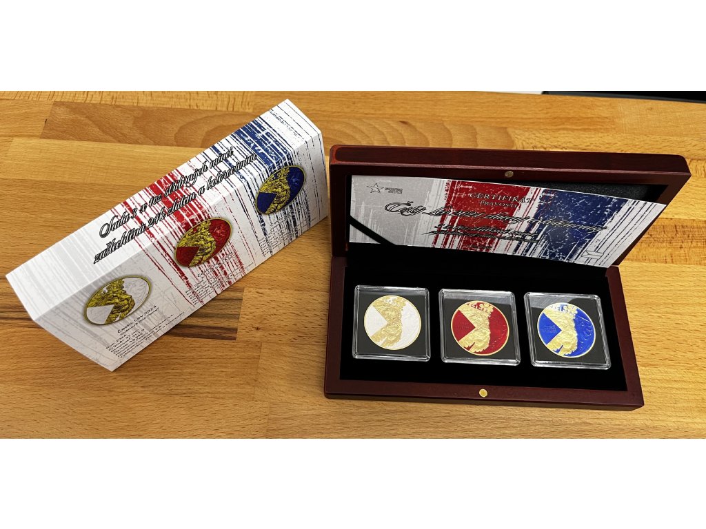 Sada 3× 1 oz stříbrná mince Český lev 2024 – kolorováno v barvách české trikolóry Oslavte s námi Den vzniku samostatného Československa s touto exkluzivní sadou tří stříbrných mincí Český lev 2024, zušlechtěných metalickými barvami české trikolóry a částečným zlacením 24karátovým zlatem. Každá z těchto tří mincí nese jednu z národních barev – bílou, modrou a červenou – a je symbolem historických i morálních hodnot, které definují český národ. Specifikace sady: