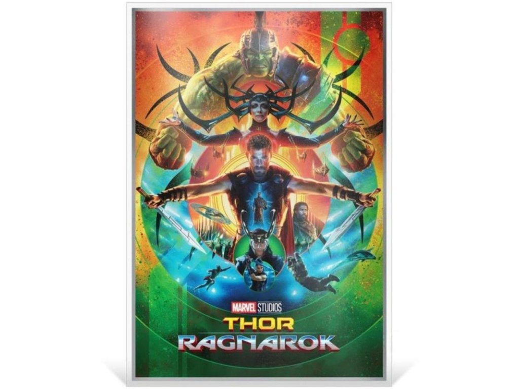 Přední strana: Dramatická scéna z Thor: Ragnarok – Thor spoutaný a připravený k boji s Hulkem, Loki i Helou. Zachycuje okamžik přeměny z pádu do triumfu, ztráty do síly.