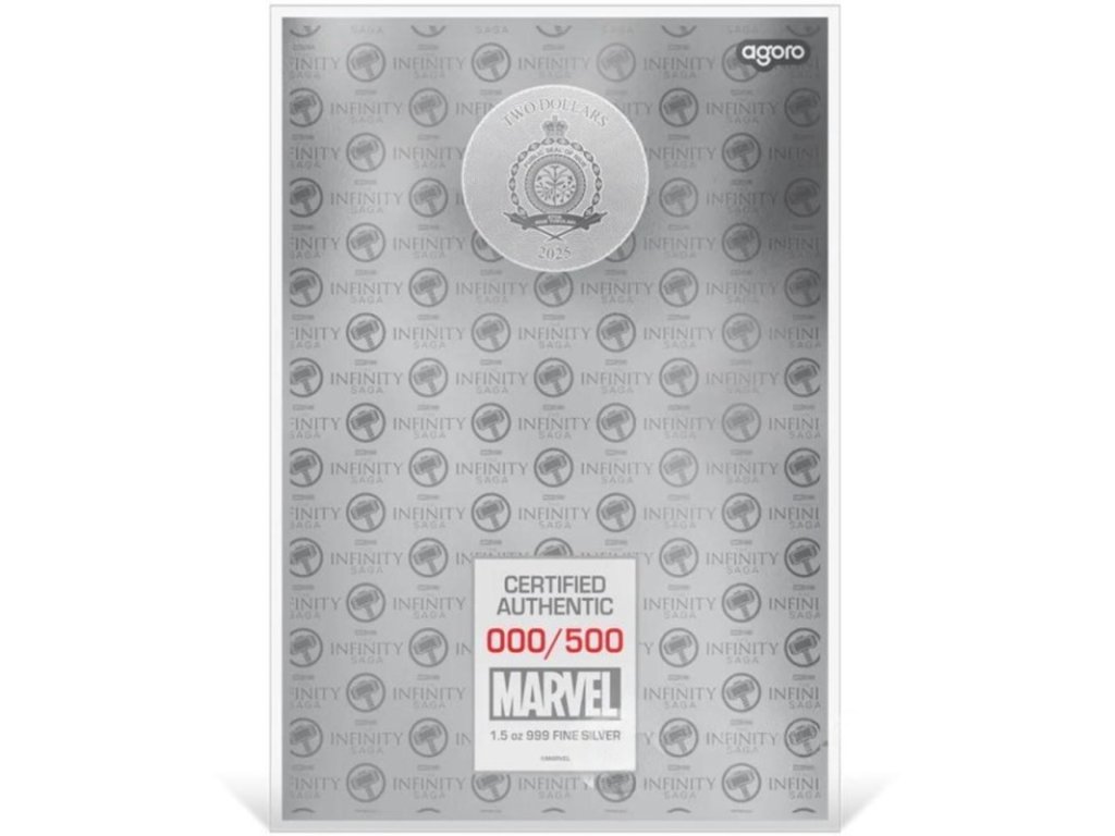 Zadní strana: Ve stylu série Infinity Saga s logy Marvel Studios, gravírovaným sériovým číslem a veřejným pečetidlem Niue.