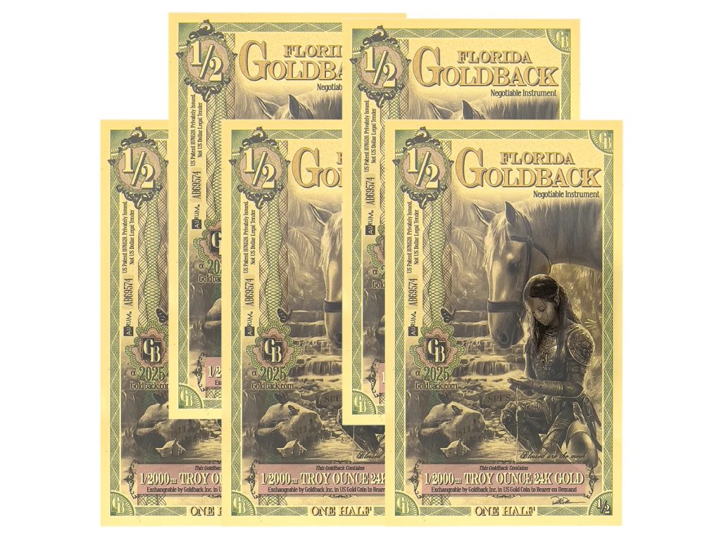 | Florida Half Goldback - 1/2 GoldbackFlorida se stala šestým státem, který nabízí oblíbenou formu měny Goldbacks, a zároveň prvním, který zavádí nominál 1/2 Goldback! Jedná se o první místní, dobrovolnou měnu ze skutečného fyzického zlata, která je zároveň krásná a plně směnitelná. Goldbacks připomínají běžné papírové bankovky, ale jsou vyrobeny z tenkých vrstev ryzího 24karátového zlata (.999). Prvně byly zavedeny v Utahu po přijetí Utah Legal Tender Act v roce 2019 a rychle se rozšířily i do dalších států – Nevady, New Hampshire, Wyomingu, Jižní Dakoty a nyní i na Floridu. Florida Half Goldback znázorňuje španělského conquistadora klečícího u mýtické Fontány mládí, obklopeného symboly obnovy, víry a floridské historie. Výjev vzdává hold ctnosti Spes (naděje) a odkazu prvních objevitelů. Specifikace produktu