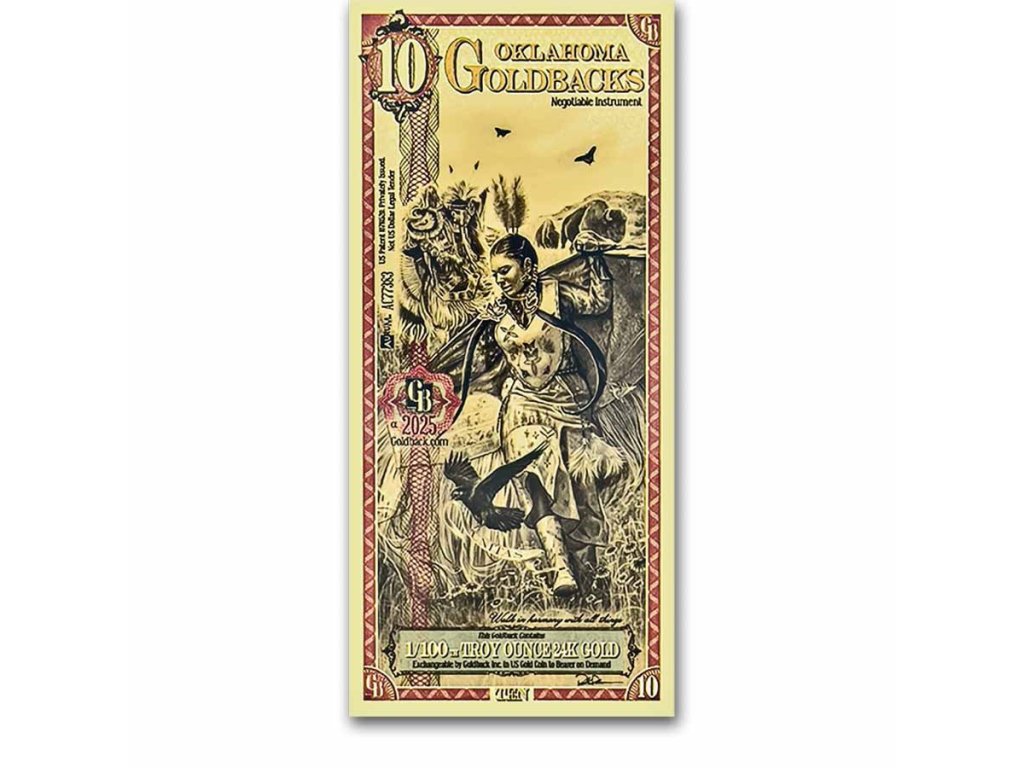 Oklahoma Goldback je součástí jedinečné série zlatých bankovek, které spojují umění, historii a skutečný obsah zlata. Oklahoma se stala nejnovějším státem, který se připojil k rodině Goldback, a představuje kolekci osmi motivů oslavujících ctnosti a kulturní dědictví státu známého jako Sooner State.